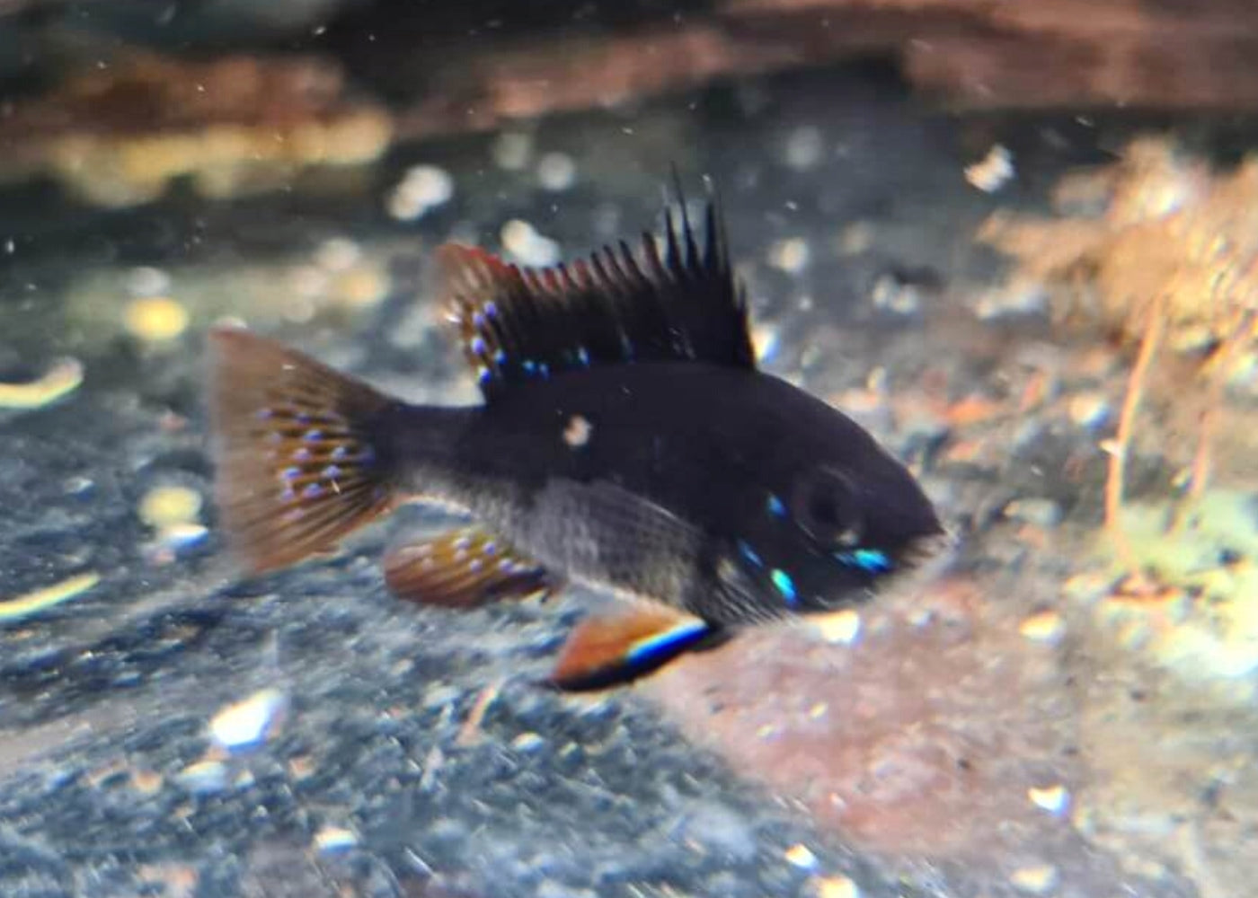 The Dark Knight Ram is a selectively bred, jet-black variant of Mikrogeophagus ramirezi, a small, strikingly coloured American cichlid native to the Orinoco River basin in South America. Known for their peaceful temperament, the Dark Knight Ram has gained popularity for its unique velvet-black coloration and suitability for community aquaria. While relatively delicate compared to hardier cichlid species, it thrives in stable, soft, and warm freshwater environments with gentle tank mates.